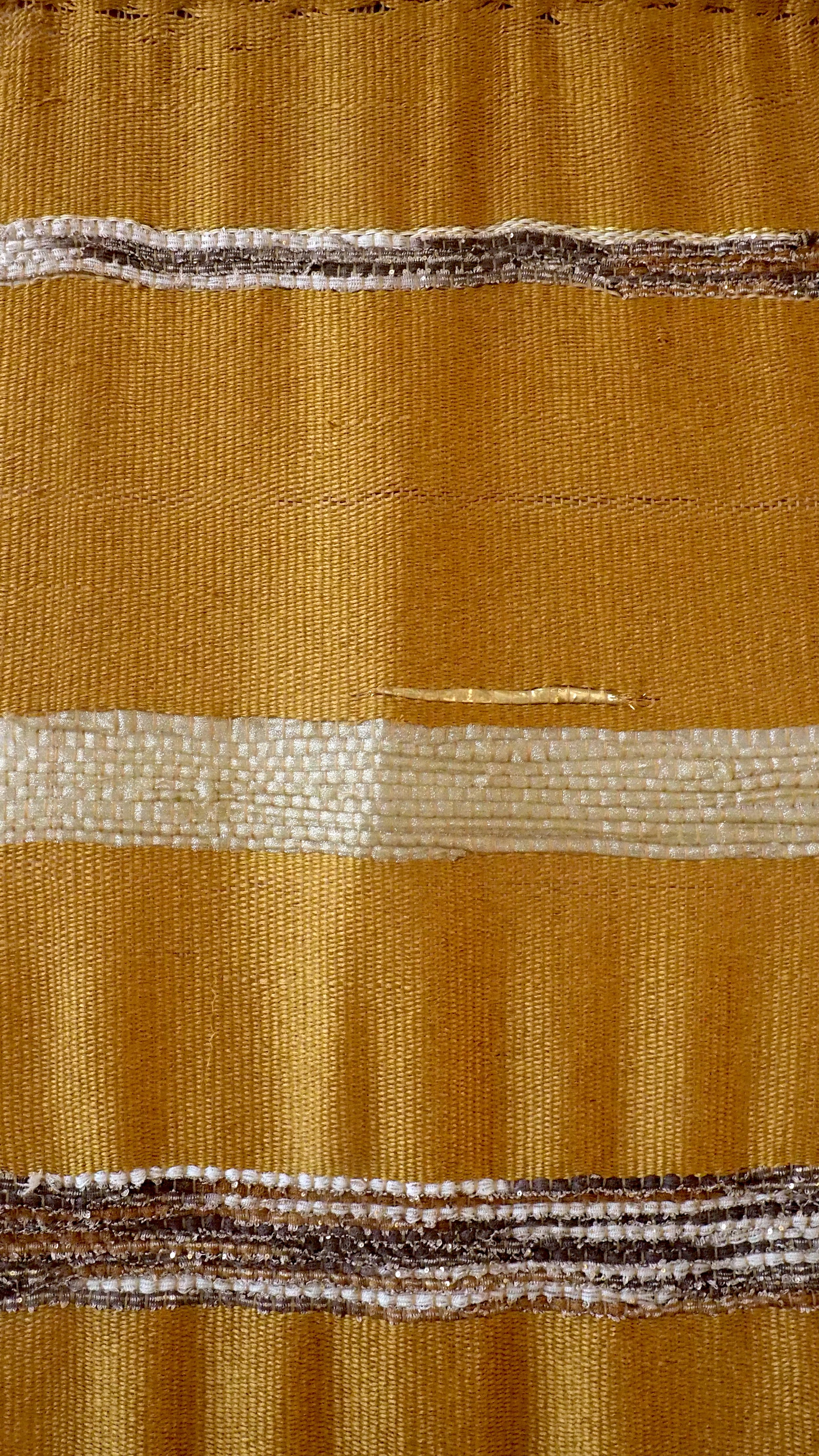 Mélange de fibres neuves et chinées. Telle une pie voleuse, je suis partie à la recherche de textiles, fils dorés.En me laissant porter par les textures, épaisseurs et matières qui accrochaient le regard.