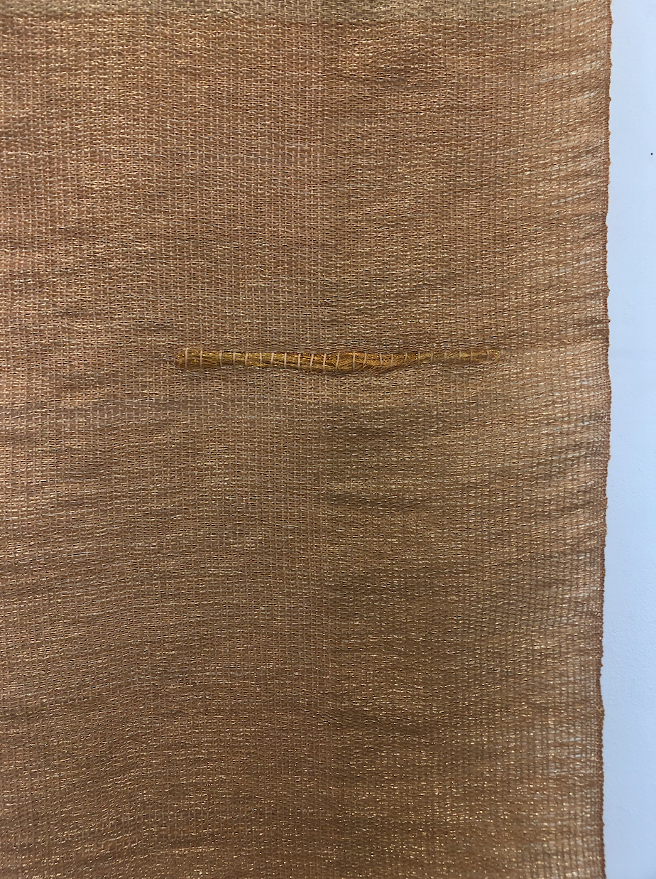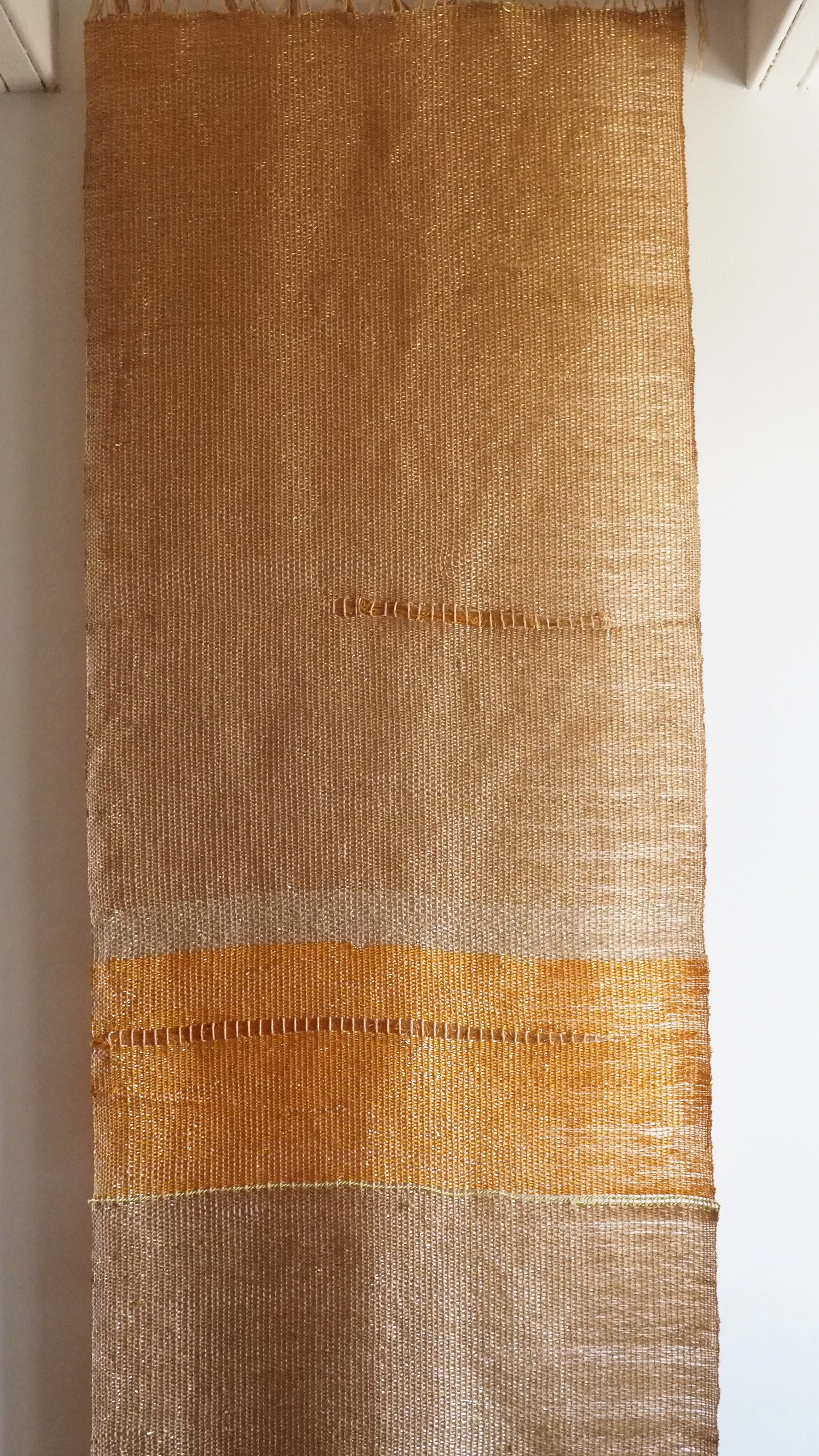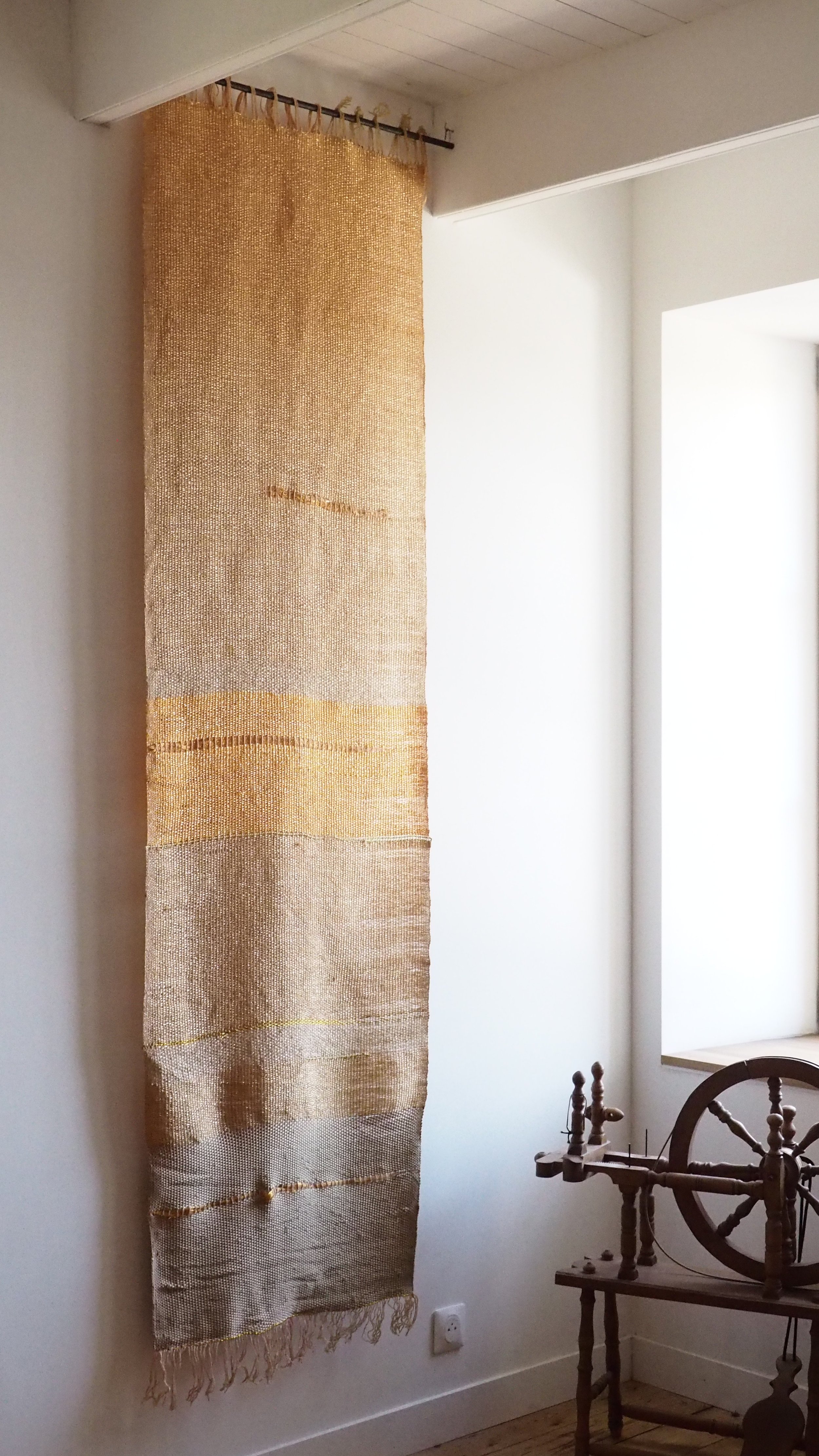 Mélange de fibres neuves et chinées. Telle une pie voleuse, je suis partie à la recherche de textiles, fils dorés.En me laissant porter par les textures, épaisseurs et matières qui accrochaient le regard.