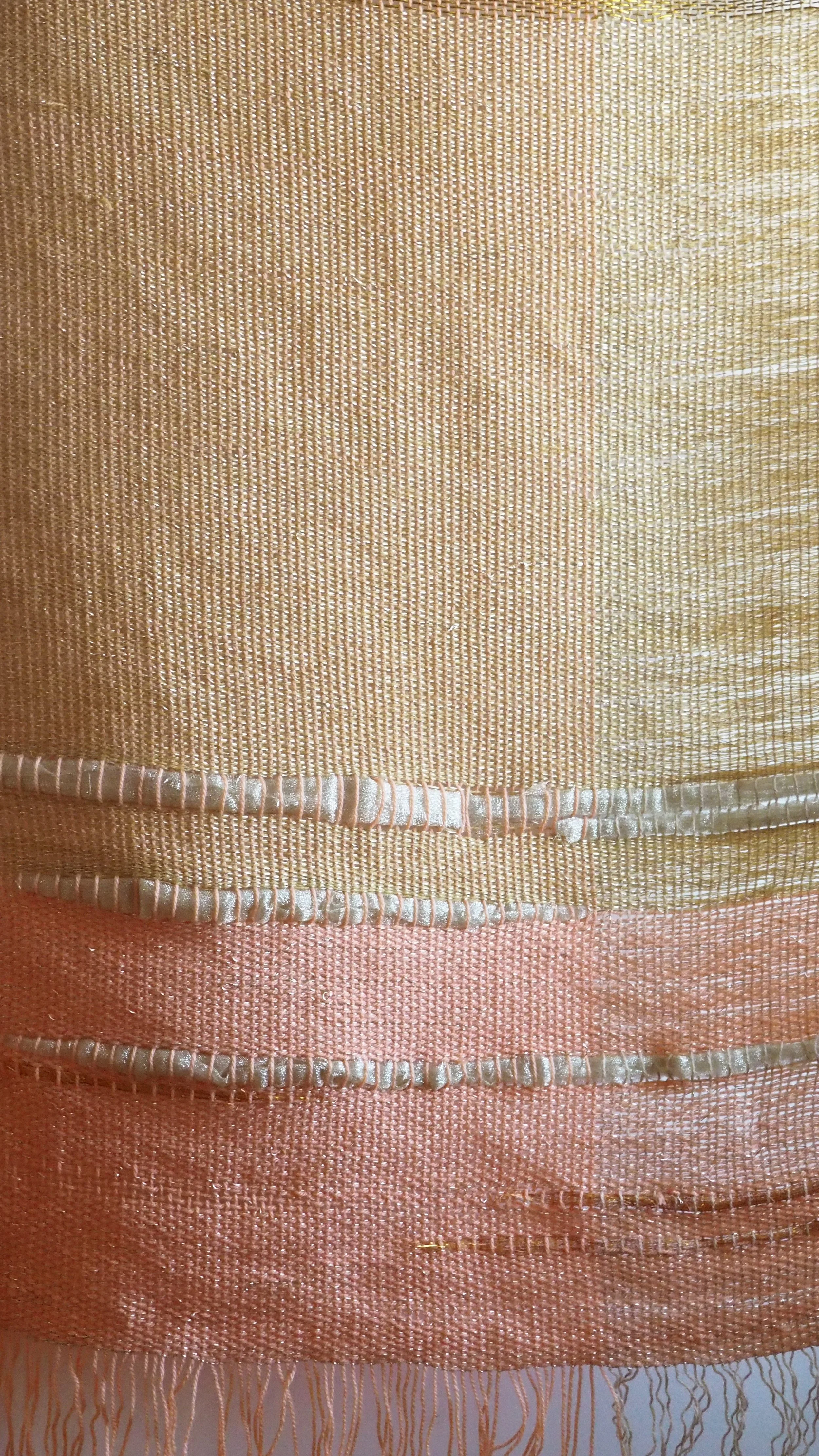 Mélange de fibres neuves et chinées. Telle une pie voleuse, je suis partie à la recherche de textiles, fils dorés.En me laissant porter par les textures, épaisseurs et matières qui accrochaient le regard.